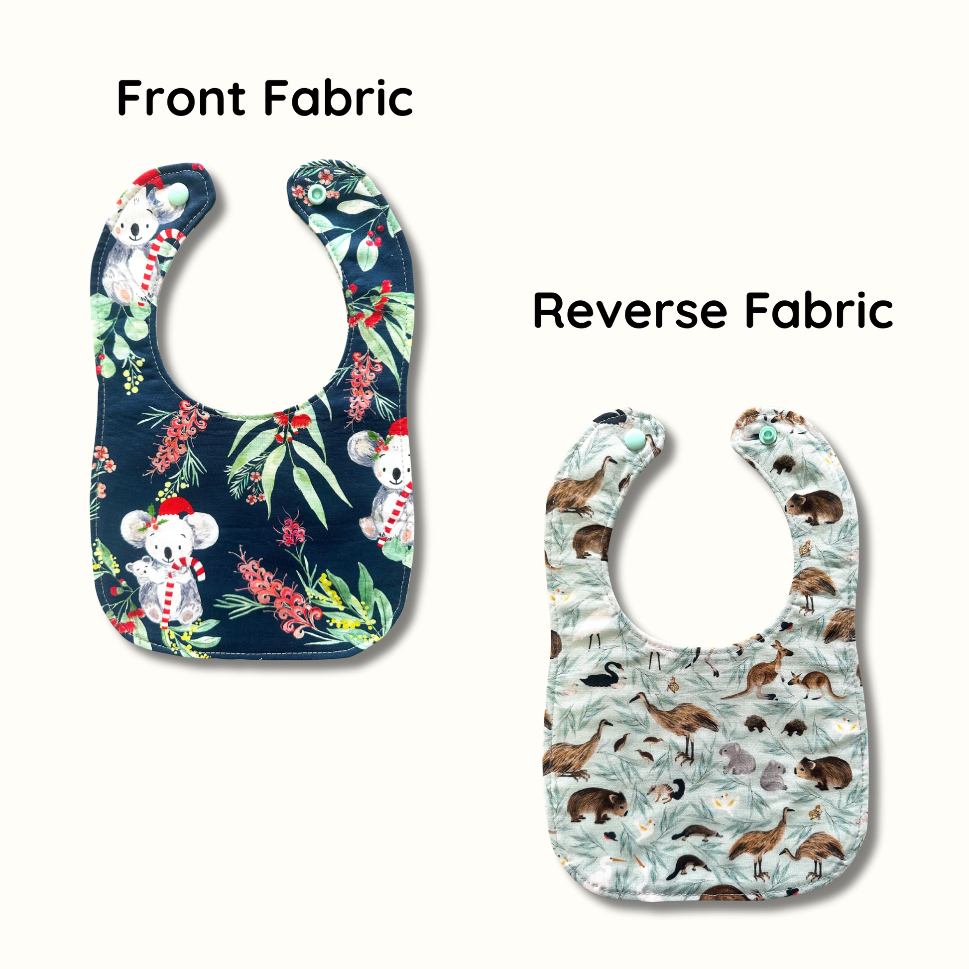 This is one of the new designs in our selection of beautiful Christmas baby bibs. The reverse fabric has been thoughtfully selected so that it can be used long after the holiday season. Perfect to bundle with other baby or fur baby items and also an easy gift to post. We have beautiful gift packaging options.